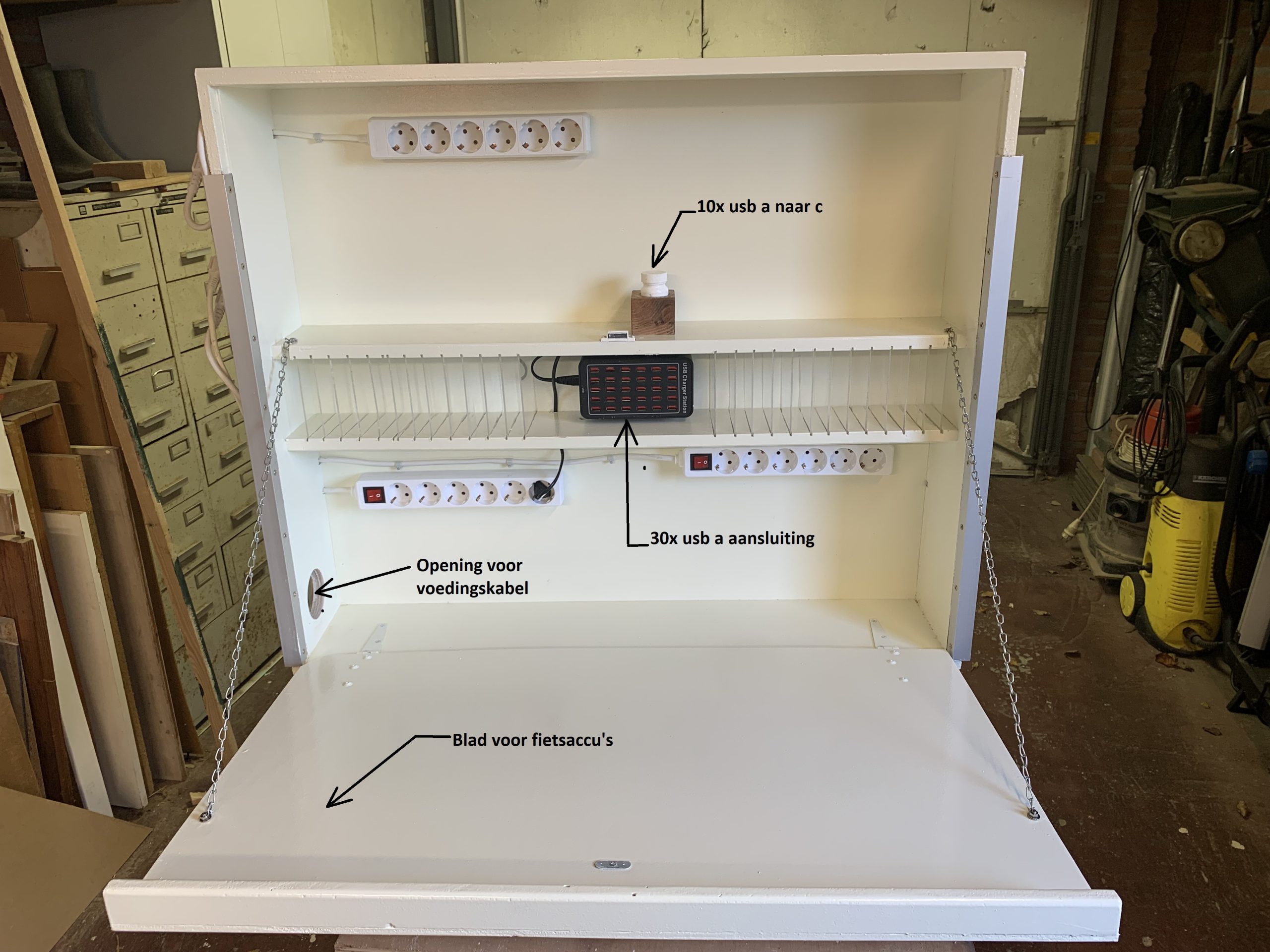 Kasper heeft voor de volgauto een mooie stekkerkast gemaakt waar iedereen z’n batterijen kan opladen.